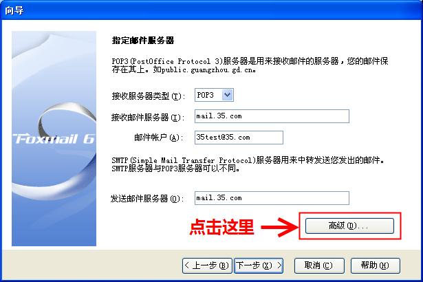 3.在"接收服务器类型"中选择"POP3"或者"imap",这里选择"POP3"(选择"imap"的情况与此类似)。填写"接收邮件服务器"、"邮件帐户"、和"发送邮件服务器"的相关信息,然后点击"高级"进入高级设置。其中,"接收邮件服务器"和"发送邮件服务器"的内容填写是:mail+"."+您公司的企业域名,例如,三五互联公司的域名为35.com,因此,此处服务器信息的填写均为mail.35.com。