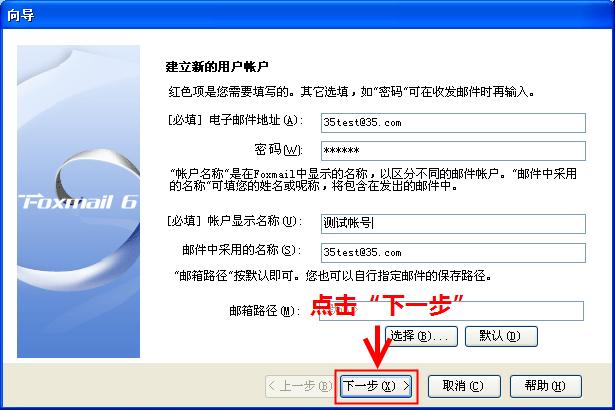 2.在弹出的向导中输入"电子邮件地址"、"密码"、"帐户显示名称"、"邮件中采用的名称"和"邮箱路径"的相关信息,然后点击"下一步"按钮。