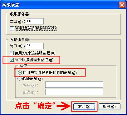 4.在弹出的高级设置中选中"SMTP服务器需要验证",并在"验证"栏中选中"使用与接收服务器相同的信息",然后点击"确定"。