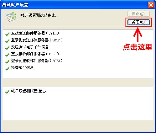 7.测试帐户设置弹出窗口会自动对以上帐户信息设置进行测试,并在下面的窗口中显示帐户设置测试是否通过。如果测试时间比较长,可以点击"停止"按钮停止测试。点击"关闭"按钮退出测试窗口,即可回到上一步,然后在上一步向导中点击"完成"按钮完成帐户设置。